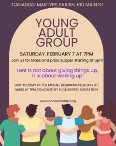 Canadian Martyrs Parish, 100 Main St., invites young adults (age 18-30) to join us for a meeting of our young adult group on February 7 at 7pm, following our Mass at 5pm and our monthly pizza supper ($). The theme for this month’s meeting is “Lent is not about giving things up, it is about waking up!”